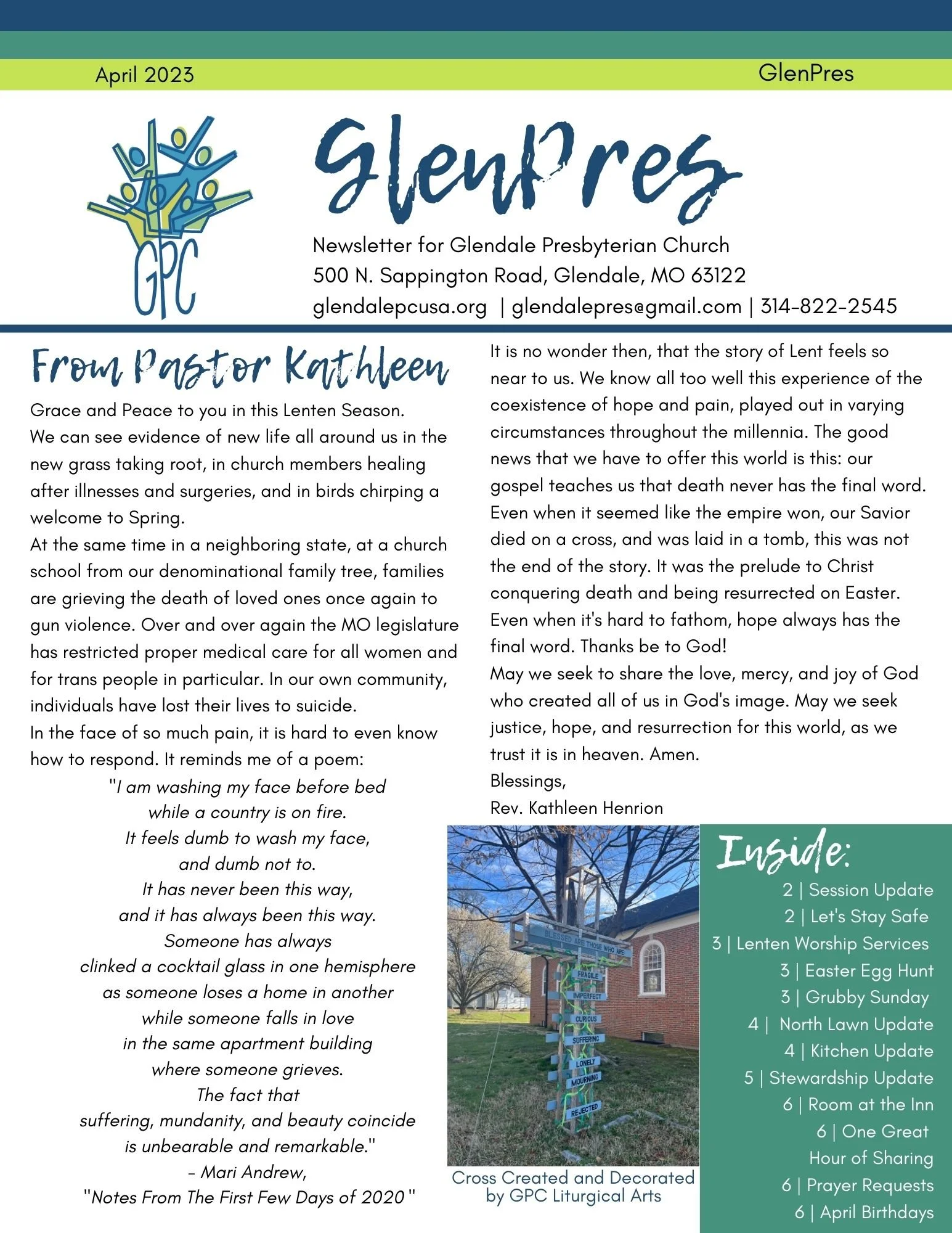 April 2023 GlenPres Click on the image above to view this month’s GlenPres newsletter.Have something to contribute to the next edition? Email it to glendalepres@gmail.com by April 24th. Glendale PresbyterianMarch 30, 2023Comment Facebook0 Twitter LinkedIn0 Reddit Tumblr 0 Likes